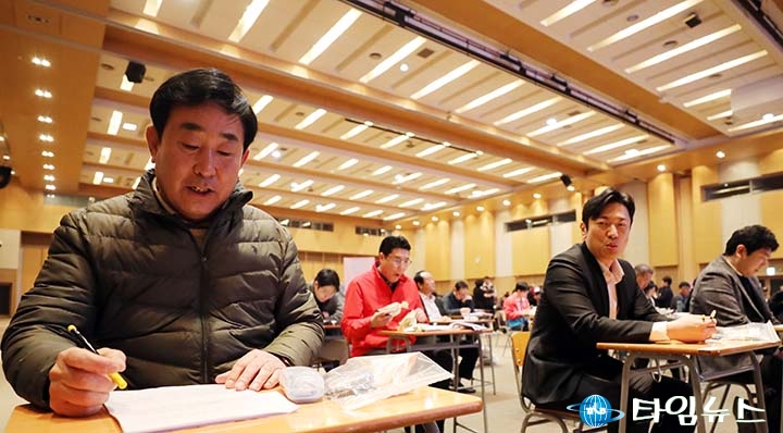 [대전타임뉴스=홍대인 기자] 이효성 대전시의회 의원이 21일 대전컨벤션센터(DCC) 그랜드볼룸에서 열린 국민의힘 공직후보자 기초자격평가(PPAT)를 앞두고 자리에서 자료를 넘겨보며 시험 준비를 하고 있다.