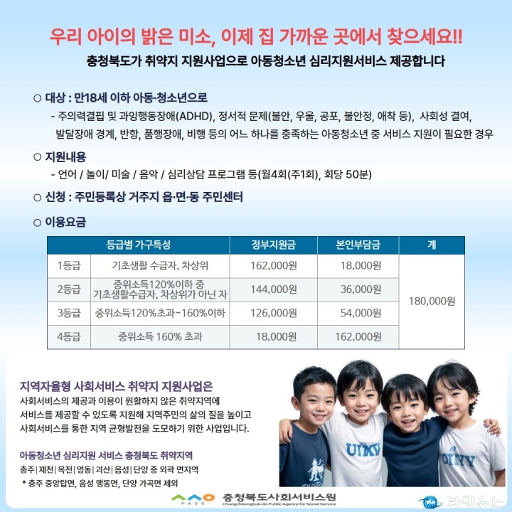 충북도는 지역별 인프라 현황에 대한 면밀한 분석을 바탕으로 서비스별 지원 대상 지역을 정밀하게 확정했다. 우선 아동·청소년 심리지원 서비스의 경우, 공급이 원활하지 않은 충주, 제천, 옥천, 영동, 괴산, 음성, 단양 등 7개 시·군의 외곽 면 지역을 중심으로 지원이 이뤄진다. 다만, 이미 자체 인프라가 충분히 갖춰진 충주 중앙탑면이나 음성 맹동면 등은 제외해 예산 집행의 효율성을 극대화했다. 또한, 제공기관이 전무해 산후조리 공백이 심각했던 보은, 옥천, 영동, 증평, 괴산, 단양 등 6개 시·군에는 산모·신생아 건강관리 서비스를 집중 투입해 저출생 위기 극복에 힘을 보탤 계획이다.
