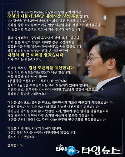 [대전타임뉴스=홍대인 기자] 더불어민주당 대전시장 경선이 결선으로 넘어간 가운데 장철민 후보는 토론을 제안하고 허태정 후보는 승리를 강조하며 맞붙었다. 더불어민주당 중앙당선거관리위원회에 따르면 대전시장 후보 선출을 위한 본경선은 4월 2일부터 4일까지 사흘간 진행됐다. 경선은 권리당원 선거인단 50%와 안심번호 선거인단 50%를 합산하는 방식으로 실시됐다. 경선 결과 장철민 후보와 허태정 후보가 결선에 진출했으며 장종태 후보는 탈락했다. 결선투표는 상위 2명을 대상으로 4월 11일부터 13일까지 사흘간 진행된다. 장철민 후보는 페이스북에서 “허태정 후보에게 결선 토론회를 제안한다"며 “늦어도 4월 8일까지 추가 토론회가 필요하다"고 밝혔다. 이어 “시간과 장소, 진행 방식은 상대 후보 결정에 따르겠다"고 말했다. 또 “장종태 후보와 유능한 통합연대로 손을 잡았다"며 “대전의 더 큰 미래를 열겠다"고 강조했다. 허태정 후보는 페이스북에서 “검증된 경험과 실력으로 끝까지 승리하겠다"며 “흔들림 없이 나아가겠다"고 밝혔다. 그는 장종태 후보에 대해 “더불어민주당의 소중한 자산"이라고 평가했다. 결선을 앞두고 토론 여부와 선거 전략을 둘러싼 양 후보 간 경쟁이 본격화되고 있다.