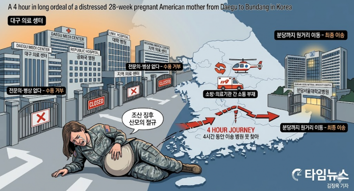 임신 28주 차인 미국인 산모 A(26)씨가 극심한 복통과 조산 징후를 보여 119에 도움을 요청했으나, 대구 시내 상급종합병원 7곳으로부터 모두 “수용 불가” 통보를 받았다.