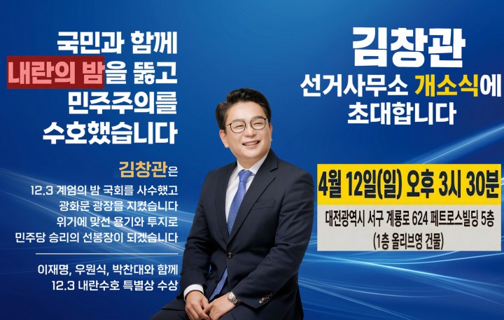 [대전타임뉴스=홍대인 기자] 김창관 더불어민주당 대전 서구청장 예비후보가 12일 대전 서구 용문동 선거사무소에서 개소식을 열고 경선 행보에 돌입한다. 민주당 대전시당은 14일부터 15일까지 서구청장 후보 선출을 위한 경선을 진행할 예정이다. 재심 인용으로 경선은 7인 경쟁 구도로 치러진다. 개소식은 후보 인사말과 참석자 인사, 기념촬영 등 간단한 형식으로 진행된다. 김 예비후보는 출마 취지와 서구 발전 방향을 주민들에게 설명할 계획이다. 김 예비후보는 “이번 경선은 서구의 미래 방향을 결정하는 과정"이라며 “당 결정을 존중하고 정면승부에 나서겠다"고 밝혔다. 또 “선거사무소는 주민 목소리를 듣는 공간"이라며 “돌봄·안전·주거·교육 등 생활행정을 중심으로 변화를 만들겠다"고 말했다.