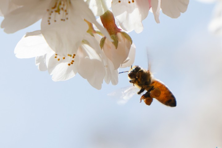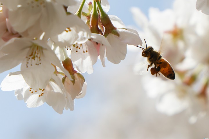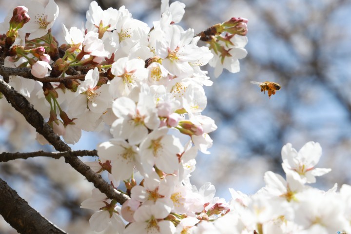 [충북타임뉴스=한정순 기자] 충북 한낮 기온이 25도까지 올라 포근한 봄을 맞은 가운데, 만개한 벚꽃 사이로 다리의 꽃가루 주머니를 가득 채운 꿀벌이 봄맞이 준비에 한창이다./충북도 제공