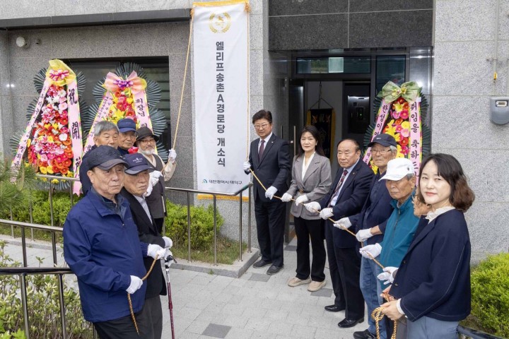 [대전타임뉴스=홍대인 기자] 대전 대덕구가 엘리프송촌A경로당을 개소하고 본격 운영에 들어가며 총 131개 경로당 체계를 구축했다. 송촌동 580번지에 조성된 경로당은 130.66㎡ 규모로 방 2개와 거실, 주방, 화장실 등을 갖춘 시설이다. 개소식에는 구청장과 국회의원, 시·구의원, 회원 등 70여 명이 참석해 현판 제막과 기념행사가 진행됐다. 엘리프송촌아파트 799세대 단지 내 설치돼 어르신 접근성과 이용 편의가 향상될 전망이다. 이선우 경로당 회장은 “공동체 공간으로 운영하겠다"고 밝혔다. 대덕구는 스마트경로당 확대와 리모델링 등 관련 사업을 추진하고 있다.