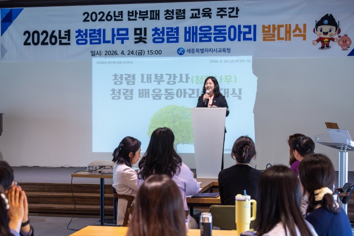 [세종타임뉴스=홍대인 기자] 세종시교육청은 24일 소담동 비전트리에서 청렴 내부 강사 위촉식과 청렴 배움 동아리 발대식을 개최했다. 이번 행사에서는 내부 구성원을 청렴 강사로 양성해 현장 중심 청렴 문화를 확산하는 방안이 제시됐다. ‘청렴 나무’는 2024년 ‘청렴 씨앗’, 2025년 ‘청렴 새싹’에 이은 단계별 청렴 인식 확산 사업이다. 선발된 20명의 강사는 국가청렴권익교육원 교육을 이수한 뒤 5월부터 11월까지 각 기관을 방문해 찾아가는 청렴 교육을 진행한다. 함께 출범한 청렴 배움 동아리는 4개 팀으로 구성돼 교육자료 제작, 정책 제안, 홍보 활동 등을 수행한다. 행사에서는 청렴 교육자료 공모전 수상작을 활용한 강의 시연도 진행됐다. 구연희 교육감 권한대행은 “청렴 나무 활동이 교직원 청렴 인식을 일상화하는 계기가 될 것"이라며 “동아리 활동에서 나온 아이디어가 세종 교육의 투명성을 높이길 기대한다"고 말했다.