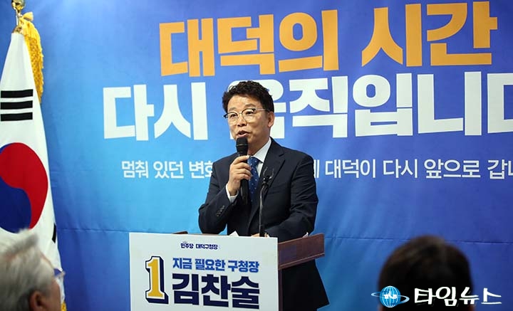 [대전타임뉴스=홍대인 기자] 더불어민주당 김찬술 대전 대덕구청장 예비후보가 25일 대전 대덕구 개소식에서 “대덕을 바꿔야 한다는 선택이 옳았다는 것을 반드시 결과로 증명하겠다"고 밝혔다. 이날 오후 2시 대덕구 중리남로 선거사무소에서 열린 ‘든든캠프’ 개소식에는 박정현·조승래·장종태 국회의원과 허태정 전 대전시장, 6·3 지방선거 출마자, 대덕구민 등 300여 명이 참석했다. 행사는 식전 공연을 시작으로 내빈 소개, 축사, 후보 인사말, 상징 전달식 순으로 진행됐다. 박정현 국회의원은 김 예비후보에게 선거운동 점퍼를 입혀주며 본선 승리를 기원했고, 김 후보 자녀는 운동화를 전달하며 선거 여정을 응원했다. 김 예비후보는 인사말에서 “이번 경선 결과는 김찬술 한 사람을 선택한 것이 아니라 대덕을 바꿔야 한다는 마음, 이제는 제대로 해보자는 마음, 말이 아니라 실행으로 보여달라는 마음이 하나로 모인 결과"라며 “그 선택의 무게를 엄중히 받아들이고 반드시 실적으로 결과를 만들어 내겠다"고 말했다. 또 “든든캠프는 구민이 어려운 일이 생겼을 때 가장 먼저 떠올릴 수 있는 사람, 말이 아니라 행동으로 보여줄 수 있는 사람, 끝까지 구민을 책임질 수 있는 사람이 되라는 의미"라며 “그 기대에 반드시 부응하겠다"고 강조했다. 그는 구정 운영 방향으로 세 가지 기준을 제시했다. “공정한 기회가 있는 대덕, 안전한 일상이 지켜지는 대덕, 풍요로운 미래가 열리는 대덕을 만들겠다"며 “누구에게나 같은 기준이 적용되는 행정과 촘촘한 점검, 책임 있는 대응 체계를 구축하겠다"고 밝혔다. 이어 “성장이 숫자로만 끝나는 것이 아니라 일자리와 지역경제로 이어져 주민 삶이 실제로 나아지는 변화를 만들겠다"고 덧붙였다. 정치 방향에 대해서도 “깨끗한 정치와 생활정치를 실천하겠다"며 “잘못된 관행은 지우고 구민의 목소리를 경청해 정책으로 설계하겠다"고 말했다. 이어 “생활정치는 연필과 지우개와 같다"며 “악습은 지우고 소통으로 새로운 정책을 만들어 가겠다"고 설명했다. 또 개인 경험을 언급하며 “아픈 가족과의 약속을 지키기 위해서라도 반드시 깨끗한 정치를 실천하겠다"고 밝혔다.