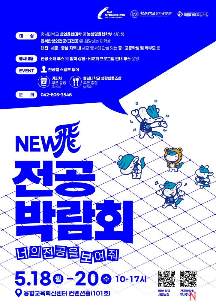 충남대 창의융합대학은 5월 18일부터 20일까지 융합교육혁신센터에서 ‘뉴비 전공박람회’를 개최한다고 밝혔다.