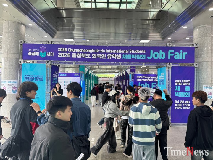 [충북타임뉴스=한정순 기자] 충청북도가 지역 경제의 새로운 동력이 될 해외 인재들의 안정적인 지역 정착을 위해 마련한 ‘2026년 충청북도 외국인 유학생 채용박람회’가 28일 충북대학교 개신문화관에서 뜨거운 열기 속에 개최됐다. 이번 박람회는 학업을 마친 유학생들이 충북에 머물며 지역 산업의 역군으로 거듭날 수 있도록 ‘취업에서 정주까지’ 이어지는 전 주기적 지원 체계를 선보였으며, 도내 8개 대학과 기업진흥원이 손을 잡고 32개 유망 기업과 700여 명의 글로벌 인재를 한자리에 모으며 내실 있는 성과를 거뒀다. 특히 제천, 보은, 괴산 등 인력을 구하지 못해 애태우던 인구감소지역 소재 13개 기업은 지역특화형 비자(F-2-R) 전환을 희망하는 유학생들과 밀착 1:1 현장 면접을 진행하며 구인난 해소의 단초를 마련했다.