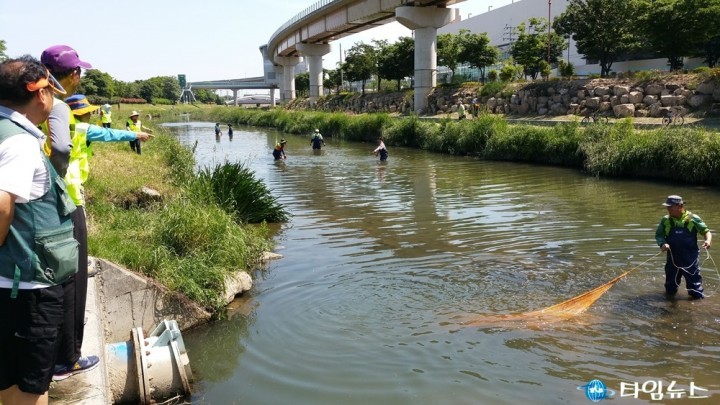 [김해=조병철기자]김해시는 『생물다양성의 날』(5월 22일)을 맞아 수생태계 건강성 증진을 위해 5월 21일 해반천 일원에서 큰입배스, 블루길 등 생태계 교란 외래어종 퇴치활동을 전개했다