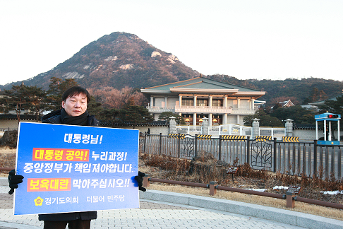 이날 릴레이 1인 시위에 나선 진용복·남종섭 의원은 “누리과정 문제가 발생하게 된 것은 박근혜 대통령의 공약사항인 누리과정 보육 예산에 대해 중앙정부가 아무런 대책이 없이 무책임하게 지방 시·도교육청에 그 부담을 전가한 것이 원인"이라고 강도 높게 비판했다.