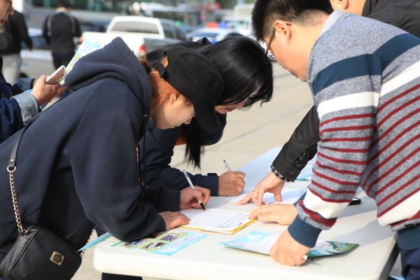 중부권 동.서 내륙철도 건설사업 국가철도망 구축계획 반영 촉구를 위한 서명에 동참하고 있는 시민의 모습[사진=천안시]
