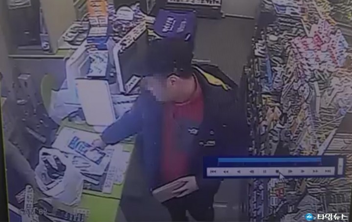 편의점 폐쇠회로에 찍힌 A씨의 모습. 강도상해 혐의로 체포된 A(28)씨가 편의점에서 범행에 사용할 목적으로 마스크를 구매하고 있다.(자료제공=원주경찰서)/ 박정도 기자