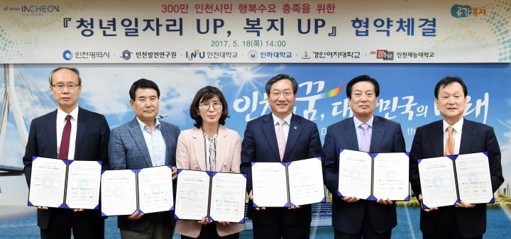 [인천타임뉴스=김민규] 인천광역시(시장 유정복)은 5월 18일(목) 인천발전연구원, 인천대학교, 인하대학교, 경인여자대학교, 인천재능대학교와 함께 대학생이 참여하는 인천형 복지모델 실현을 위한 청년일자리 UP, 복지 UP 협약을 체결했다.