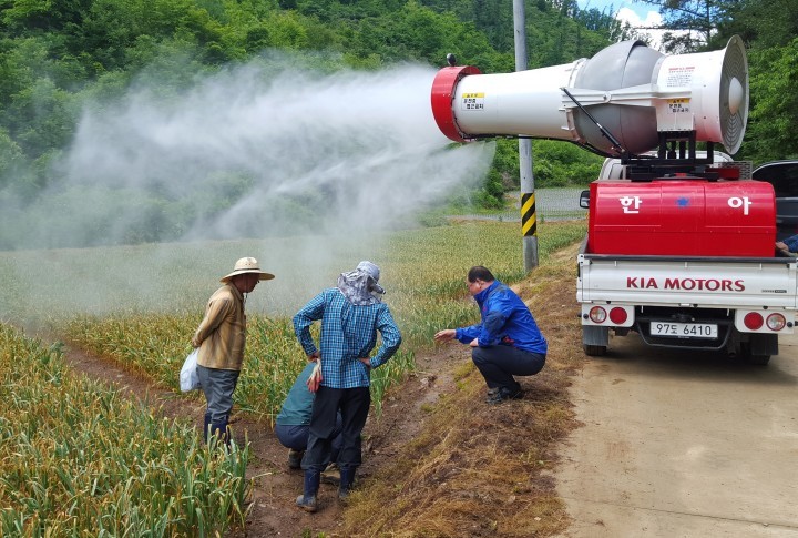 단비기동대는 광역살포기와 급수차량 등을 이용해 40여톤의 농업용수를 마늘밭에 지원했다.가믐으로 단양마늘작황에 비상이걸려 살수기로 윗물주기를 하고있다.