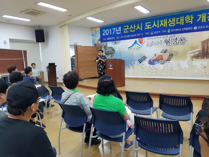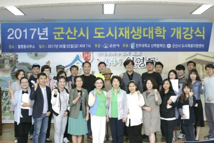 군산시는 지난 2일 월명동 주민센터에서 도시재생대학 수강생 등 60여 명이 참석한 가운데 17년도 하반기 도시재생대학 개강식 및 오리엔테이션을 실시했습니다.