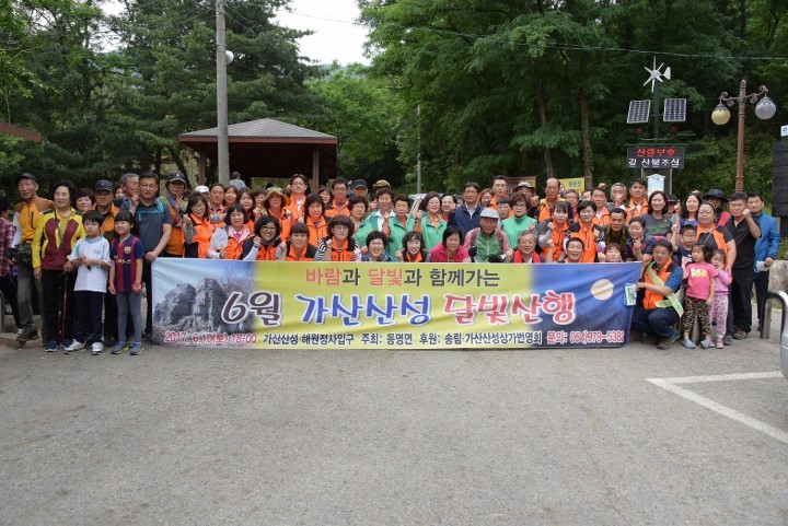 [칠곡타임뉴스] 6월 달빛산행은 '바람과 달빛과 지역민이 함께 떠나는 산행' 을 주제로 지난 10일 오후6시 해원정사 입구 주차장에서 지역 기관단체(동명의용소방대, 송림·가산산성 상가번영회) 회원 및 인근지역주민 약 100여명이 모여 '달빛산행 화이팅' 을 외치며 산행을 시작했다.