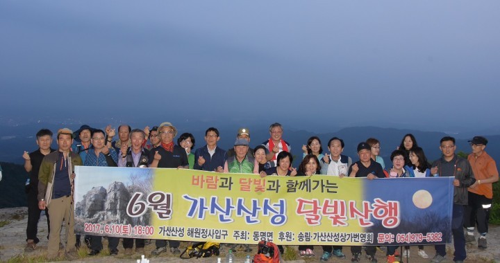가산바위까지 동행한 참여자들은 간단한 저녁식사 후 가산바위의 별빛과 바람을 가슴에 담고 다음 달빛산행을 기약하며 하산 했고, 이날 산행 시작 전 동명의용소방대 회원님들이 여름철 산행 안전캠페인을 실시해 준 덕분으로 한건의 안전사고도 없이 산행을 마무리 했다.