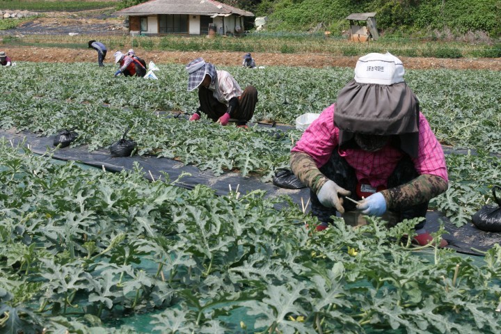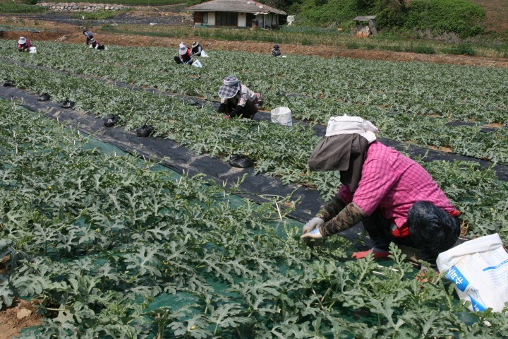 가름을 이겨내고 잘 자라고 있는 수박농가들은 지난 14일 어상천면 율곡리의 수박재배 농가에서는 곁순 제거와 유인작업이 한창이다.