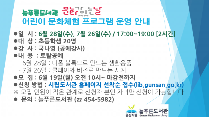 ‘문화가 있는 날 어린이 문화체험 프로그램’은 오는 19일부터 시립도서관 홈페이지(lib.gunsan.go.kr)에서 참여 어린이를 선착순으로 접수하며, 기타 자세한 사항은 시립도서관 홈페이지를 참조하거나 늘푸른도서관(☎ 454-5982)으로 문의하면 됩니다.