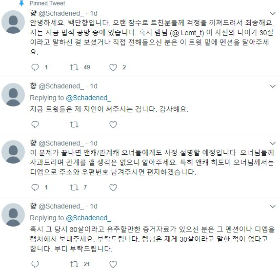 박양의 트위터 계정(향 @Schadened_)에는 '안녕하세요. 백단향입니다. 오랜 잠수로 트친분들께 걱정을 끼쳐드려서 죄송해요. 저는 지금 법적 공중중에 있습니다. 혹시 렘님(@Lemt_t)이 자신의 나이가 30살이라고 말하신 것을 보셨거나 직접 전해들은 분은 이 트위 맡에 멘션을 달아주세요”라고 올렸다.
