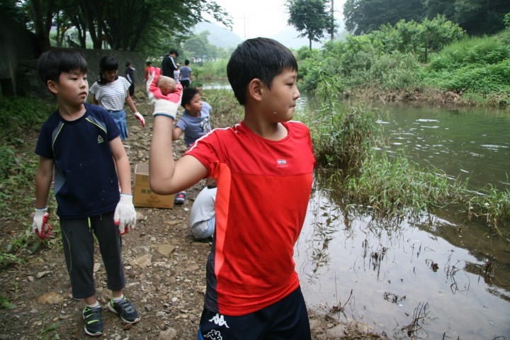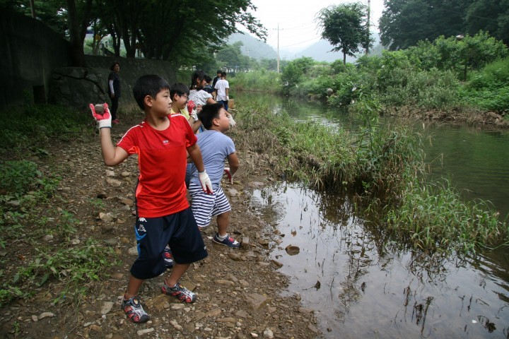 대가초등학교 학생들이 흙공을 대가천에 던지고 있다.