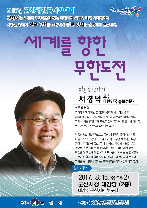 군산새만금아카데미에서는 광복 72주년을 맞이하여 오는 16일 오후 2시 군산시청 대강당(2층)에서 우리 영해와 독도의 중요성을 전세계에 알리는 대한민국 홍보 전문가 서경덕 교수를 초청하여‘세계를 향한 무한도전’이란 주제의 특강을 실시한다.