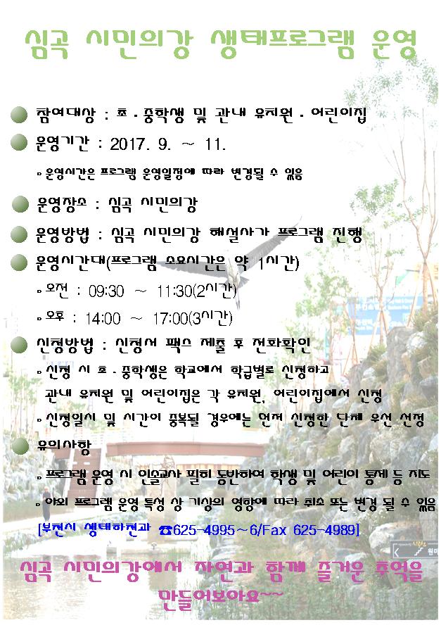 프로그램은 ▲심곡 시민의강 유래와 조성취지 등을 설명해주는 심곡 시민의강 바로알기, ▲심곡 시민의강에 서식하는 동․식물 해설 및 ▲자연물 만들기 등으로 꾸며지며 특히 연령대별 맞춤형 생태프로그램으로 진행하여 참여인원들이 좀 더 이해하기 쉽게 프로그램을 구성하였다.
