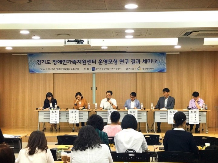 ‘경기도 장애인가족지원센터 운영모형 연구’를 진행한 경기복지재단 사회정책팀 이병화 연구위원의 연구결과 발표를 시작으로 장애인복지관 실무자, 관련학과 교수, 경기도 장애인복지 담당 공무원이 모여 ‘경기도 장애인 가족지원센터 역할정립 및 장애인가족 맞춤형 복지서비스 제공방안을 위한 토론회’로 진행되었다.