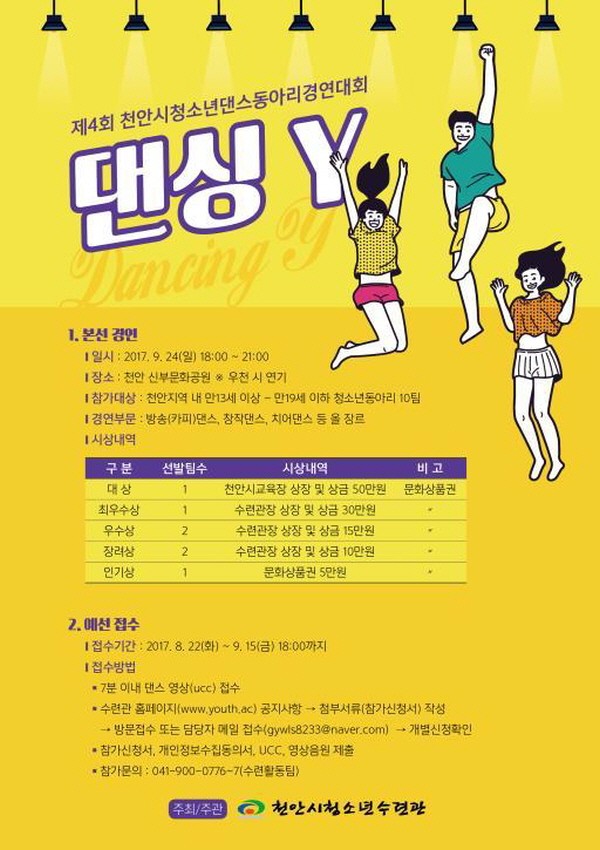 [천안타임뉴스=최영진 기자] 천안시청소년수련관(관장 유준수)이 오는 9월24일 제4회 천안시 청소년동아리댄스경연대회 ‘Dancing Y’를 개최한다.