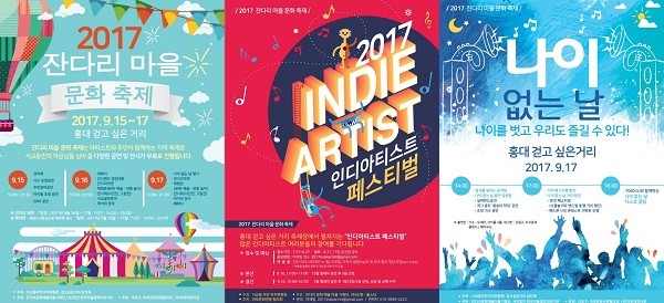 [서울타임뉴스=송용만기자] 다가오는 9월 15, 16, 17일 3일간 홍대 걷고 싶은 거리에서‘인디밴드 경연대회’, ‘나이 없는 날’, ‘1기 홍대 가디언즈’, ‘기억, 홍대 앞 이미지 신대동여지도’ 등 많은 프로그램으로 ‘잔다리 마을 문화축제’가 펼쳐진다.