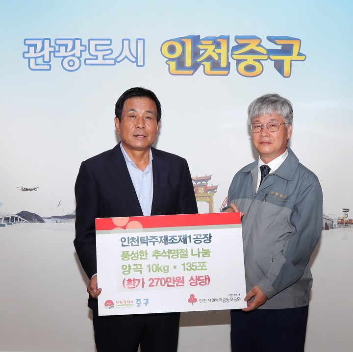 김홍석 중구청장은 “꾸준한 나눔실천을 통해 주변의 이웃을 돌아보고 보듬는 따뜻한 손길에 감사드리며 인천탁주의 이웃을 위한 이러한 마음이 잘 전달될 수 있도록 최선을 다하겠다”고 다짐했다.