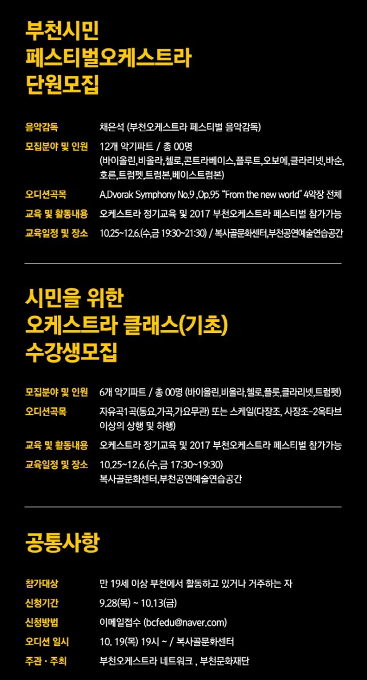 재단은 발족식에 참여하는 오케스트라 외에 ‘부천시민페스티벌오케스트라’를별도 구성해 단원을 모집하고, 정기 교육 뒤 폐막공연 연주도 추진할 계획이다. 만 19세 이상으로 부천에서 활동하고 있거나 거주하고 있는 사람이면 누구나 신청할 수 있다.