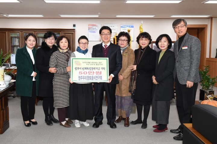 [영주타임뉴스=송용만기자] 영주시우리향토음식연구회(회장 안정자)는 지난 23일 영주시청을 방문해 장학금 150만원을 영주시인재육성장학회에 기탁했다. 영주시우리향토음식연구회는 10월 21일부터 29일까지 영주풍기인삼축제에서 인삼을 활용한 웰빙인삼요리체험장을 운영해 인삼한우육전과 인삼사과쨈 샌드위치 판매 수익금 50만원을 기탁했다. 안정자 회장은 인삼축제 죽령주막 향토음식점 판매수익금 100만원을 별도로 추가 기탁했다. 우리향토음식연구회는 2011년부터 매년 기부해 누적기부 270만원, 안정자 회장은 2009년부터 매년 기부금이 650만원에 달한다. 우리향토음식 연구회 회원들은 “미래를 위해 투자하는 것이 가장 가치 있는 일이라고 생각해 매년 인재육성장학금을 기부하고 있는데 적재적소 미래 꿈나무들에게 유익하게 지원해 주는 것으로 알고 있다"며 “영주에 작게나마 보탬이 될 것이라는 기대와 함께 마음의 행복을 덤으로 얻고 있다"고 기부의 뜻을 밝혔다. 우리향토음식연구회는 영주 향토음식 개발, 영주의 대표음식사찰음식과 선비음식, 길거리 청년창업 메뉴개발 뿐 아니라 시식회를 통해 보다 현실성 있는 공익적 연구 활동영역을 넓혀 지역 봉사와 대외적인 입지를 강화해 나가고 있다. 1996년 지역 농산물 소비초진을 위한 향토음식 교육을 목적으로 조성한 단체로 지금까지 20년 넘게 영주시농업기술센터에서 육성 관리하는 단체이며 지금은 60여명의 회원이 지역 향토음식의 조사 연구, 개발 및 보급 활동을 지속적으로 이어가고 있다.