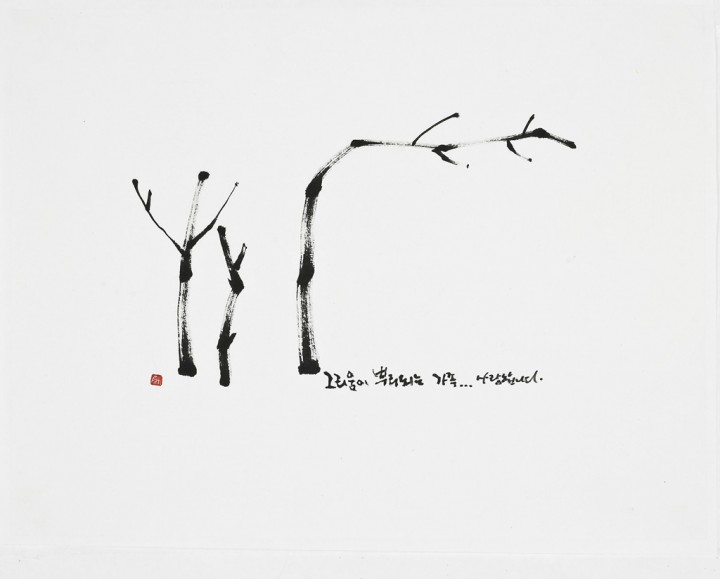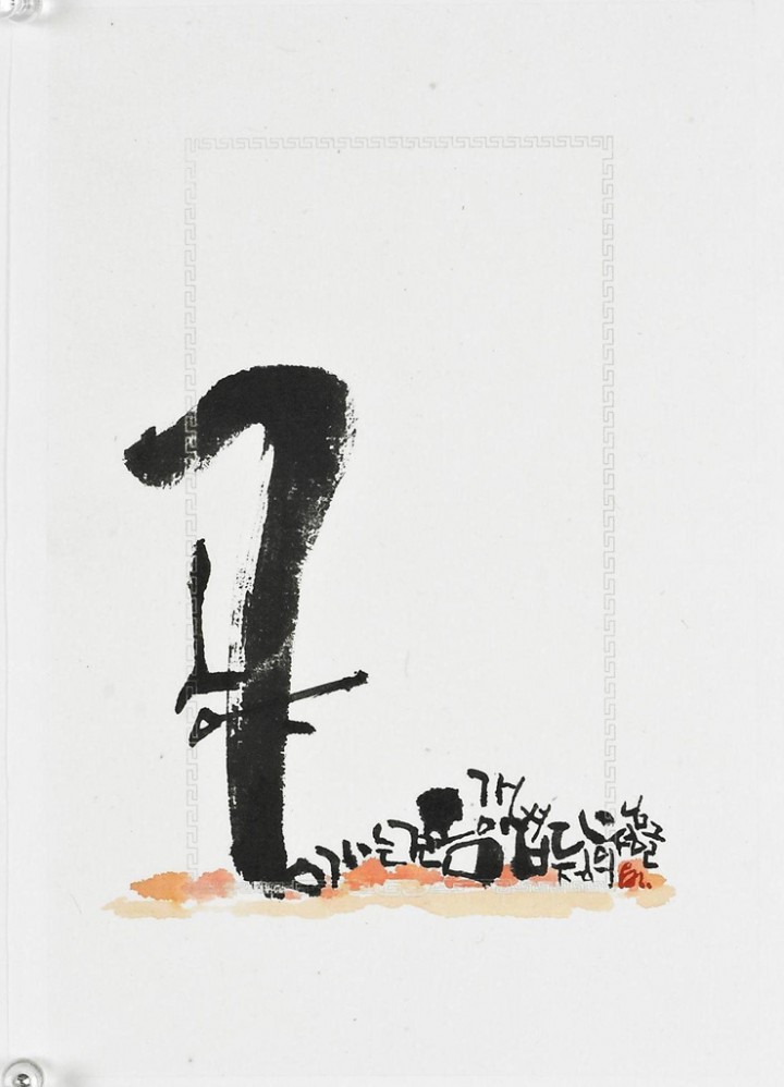혜당 이민지 작가의 문자추상 작품은 먹빛의 음영과 선의 굵기에 따라 문자는 춤을 추듯 현란함으로 시작한다. 의미를 단순화시켜 끝은 조용하며 정갈하다. 하얀 한지 위에 극명하게 대비되는 검은 먹빛의 흔적은 삶에 대한 성찰과 진지함으로 가득하다.