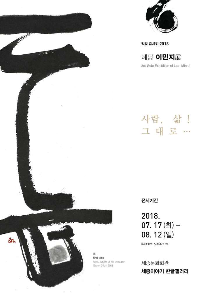 [서울타임뉴스-김수종 기자]전통서예를 기반으로 문자추상의 오묘함과 깊은 뜻을 감상할 수 있는 '먹빛 춤사위 2018 혜당 이민지展'이 오는 17일(화)~ 8월 12일(일)까지 서울시 세종문화회관 세종이야기 한글갤러리에서 진행된다.