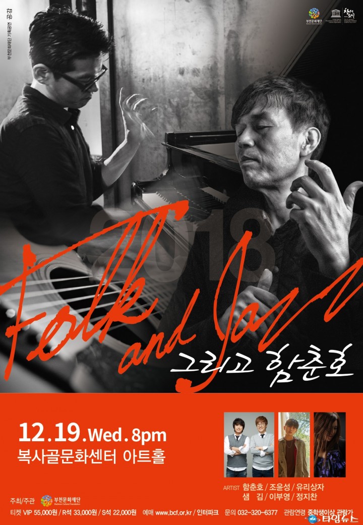 한편 자타공인 최고의 기타리스트 함춘호의 유려한 연주와 게스트의 하모니가 돋보인다.재즈 피아니스트 조윤성과 발라드 감성듀오 유리상자, 재즈 보컬리스트 이부영, '나는 가수다'의 음악감독 출신 가수 정지찬, K-POP스타 샘 김, J.shin 등이 공연을 함께한다. 또한 공연 후에는 함춘호와 조윤성의 팬싸인회가 준비되어 있다. 옛 명곡부터 신세대들의 포크 감성까지 두루 즐길 수 있는 이번 콘서트는 소중한 사람과 함께하는 멋진 송년회를 계획하는 이들에게 행복한 추억을 선사할 것이다.티켓 가격은 R석 55,000원, S석 33,000원, A석 22,000원이며, 직장인은 30%까지 할인받을 수 있다. 예매는 재단 홈페이지(www.bcf.or.kr) 또는 인터파크 티켓(ticket.interpark.com)에서 가능하다. 공연 문의는 공연기획부(032-320-6377)로 하면 된다.