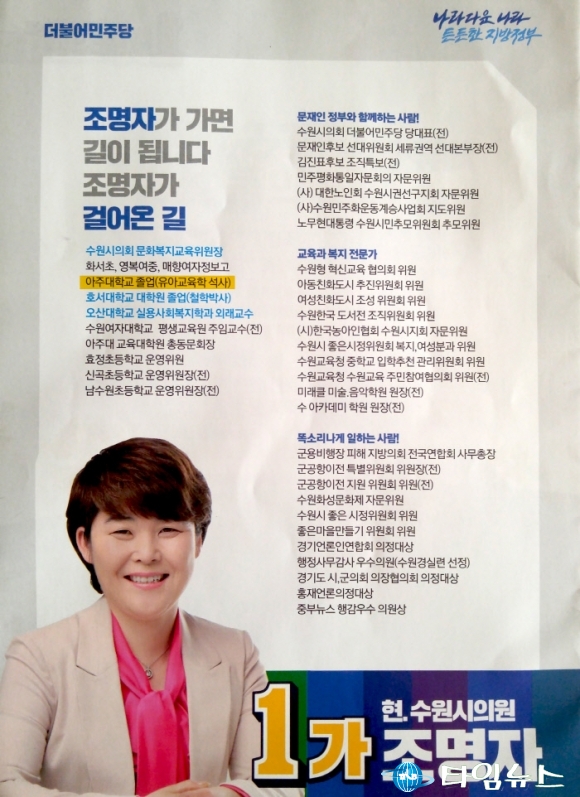 먼저 조의장은 공식 선거운동이 시작되기도 전에 이미 시의회 홈페이지 프로필에 학력을 ‘아주대학교 졸업(유아교육학 석사)’으로 표시했다.
