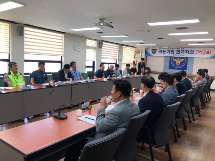 [제천타임뉴스=김정욱] 제천경찰서(서장 신효섭)는13일 경찰서 2층 소회의실에서 제천금융단협의회 회장 등 금융기관 관계자 14명과 보이스피싱 예방을 위한 간담회를 개최했다.