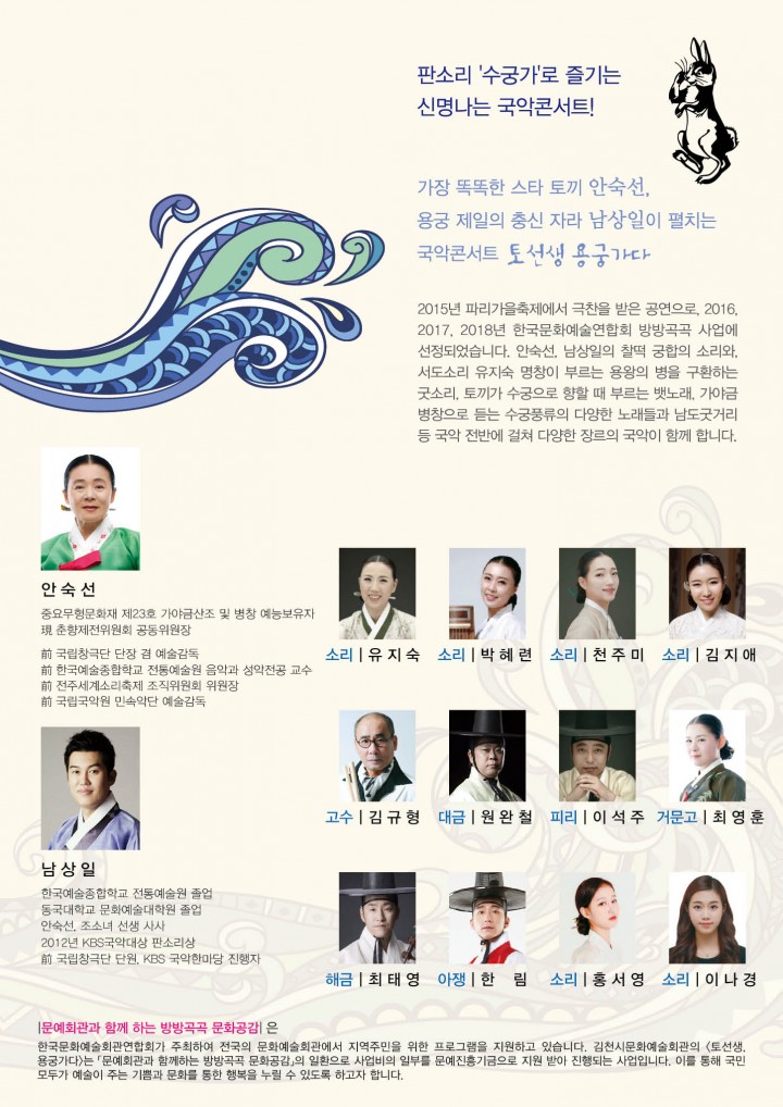 [김천타임뉴스=김이환 기자] 김천시문화예술회관에서는 시민들의 문화예술 향유를 위해 안숙선과 남상일의 국악콘서트 ‘토선생, 용궁가다’를 오는 7월 5일(금) 오후 7시 30분 대공연장에서 개최한다.