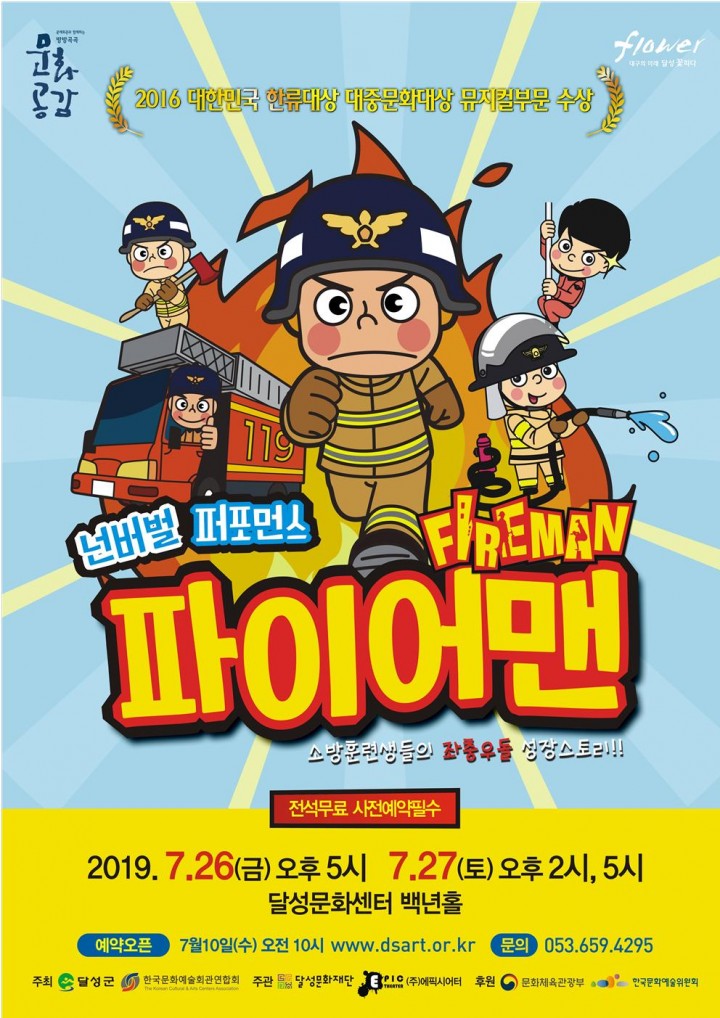 본 공연은 한국문화예술회관연합회에서 주최하는 「문예회관과 함께하는 방방곡곡 문화 공감」 사업공모에 선정되어 일부 사업비를 지원받아 추진되는 지역주민을 위한 사업이다. 달성문화재단은 여러 공모사업을 통하여 달성군민의 문화 향유권 확대를 위하여 꾸준히 노력하고 있다. <파이어맨>은 장난기 많고 철없는 소방훈련생들이 훈련을 통해 강인한 소방관으로 성장하는 이야기이다. 특히 훈련모습과 열정을 아크로바틱의 역동적인 움직임과 ‘파쿠르(parkour)’의 화려한 기술로 표현, 공연시간 70분 내내 보는 재미를 더한다. 또 어린이들이 가장 좋아하는 직업중 하나인 소방관을 소재로 했으며 대사 없이 온몸으로 표현하는 넌버벌 공연으로 남녀노소 온가족이 함께 즐길 수 있을 것으로 기대된다. 공연단체인 ㈜에픽씨어터는 2015년 초연을 시작으로 전국순회공연과 해외공연을 꾸준히 하고 있다. 또한, 서울소방재난본부로부터 감사패 수여와 2016 대한민국 한류대상에서는 대중문화대상을 수상하기도 했다. 2018년에는 평창올림픽 및 패럴림픽 성공개최기념 초청공연을 한 바 있다. 이번 공연은 무료공연으로 7월 10일 오전10시부터 달성문화재단 홈페이지(www.dsart.or.kr)를 통해 선착순 사전예약 가능하며 사전예약자는 공연시간 10분전까지 좌석권을 받을 수 있다. 문의) 053-659-4295