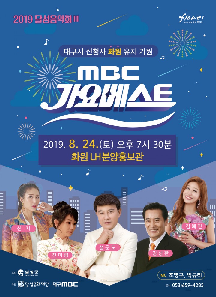 [달성타임뉴스=김이환 기자] 달성문화재단은 오는 8월 24일(토) 오후 7시 30분 화원 LH분양홍보관에서 2019 달성음악회 시리즈로 ‘MBC 가요베스트’를 개최한다.