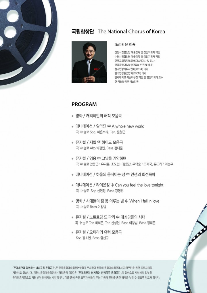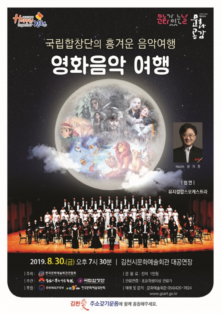 ‘영화음악 여행’은 <문예회관과 함께하는 방방곡곡 문화공감> 작품 중 국·공립 예술 단체 우수공연으로 선정된 작품이며 복권기금 문화나눔의 일환으로 한국문화예술회관연합회가 주관하여 전국의 문화예술회관에서 지역주민을 위해 진행하는 프로그램이다. 이날 공연에는 예술감독 윤의중 지휘자가 이끄는 국립합창단과 협연으로는 뮤지컬팝스오케스트라가 출연한다. 1973년 창단된 국립합창단의 윤의중 상임지휘자는 국내 주요 합창단의 예술감독과 지휘자로 수년간 활동하였으며 2005년 미국 미네아폴리스에서 열린 ‘국제남성합창페스티벌’에서 한국인 최초 객원지휘자로 초청받아 세계 각국에서 선발된 500여 명의 연합 합창단을 지휘하였고, 2015년 싱가포르 ‘국제합창페스티벌’ 심사위원 등을 맡아 국제적으로도 실력을 인정받았으며 세밀하고 정확한 지휘로 깊이 있는 합창 무대를 만들어 낸다는 평가를 받고 있다. 이번 공연은 영화 ‘캐리비안해적 모음곡’을 오케스트라 연주로 시작하여 에니메이션 ‘알라딘’, 뮤지컬 ‘지킬 앤 하이드’ 등 대중에게 친숙한 음악들로 프로그램이 구성되어 클래식을 보다 쉽게 이해할 수 있도록 짜여졌다. 또한 윤의중 지휘자의 열정적인 지휘와 뮤지컬팝스오케스트라가 협연하여 합창단의 풍성하고 화려한 공연으로 김천시민들의 눈과 귀를 사로잡을 예정이다. 공연시간은 약 70분 정도이며, 초등학생이상 관람이 가능하다. 공연 관람료는 전석 1만원이며 유료회원은 30% 할인 된 가격에 구매할 수 있다. 또한, 관람권 구입은 8월 14일(수) 오후 2시부터 문화예술회관 홈페이지(www.gcart.go.kr) 등을 통하여 예매할 수 있다.