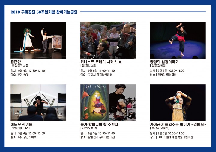 극장공연은 금오공대 대강당과 소극장 공터다에서 4일간 4작품이 무대에 오르게 된다. 9월4일 저녁7시30분에 금오공대 대강당에서는 공상집단 뚱딴지의 가족음악극 <이솝우화>가 전석 초대공연으로 진행된다.9월5일은 웃음을 자아내는 그림이야기<잠깐만>이, 9월6일은 서커스 음악극 <체어,테이블,체어>가, 9월7일은 드로잉 서커스 <크로키키 브라더스>가 각각 저녁8시에 소극장 공터다에서 공연될 예정이다. 특히, 올해는 공단50주년이 되는 해로 구미아시아연극제 연계행사로 공단 내 기업체와 기업체 어린이집 등을 방문하여 근로자와 가족들의 사기를 북돋우는 <공단50주년 기념 찾아가는 공연> 행사를 준비했다.