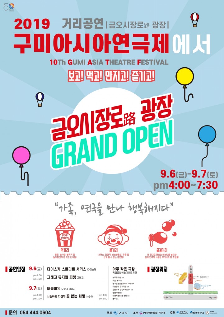 - 도심에서 펼쳐지는 다양한 공연들, 2019 구미아시아연극제9월 4일부터 7일까지 소극장 공터다, 금오공대, 그리고 금오시장로 일대에서는 한국연극협회 구미지부 주관으로 ‘구미아시아연극제’가 개최된다. ‘가족, 연극을 만나 행복해지다’는 슬로건 아래 진행되는 이번축제는 총 4일간 가족음악극을 비롯한 마임, 드로잉서커스 등 <극장공연>과 더불어 오는 6일~7일에는 오후 4시부터 금오시장로(路)가 거리 공연장으로 변신한다. 거리를 무대삼아 ‘아주 작은극장’, ‘다이스케 스트리트 서커스’, ‘버블마임’ 등 볼거리 가득한 <야외거리공연>이 펼쳐져 시민들과 만날 예정이다.거리공연에 따라 6일, 7일 양일간 오후 1시부터는 금오시장상가 앞 도로가 차단될 예정이다.