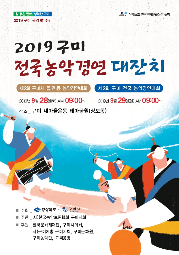 [구미타임뉴스=김이환 기자] 구미시는 오는 9월 28일과 29일 양일간, 구미새마을운동테마공원에서 「2019 구미전국농악경연대잔치」를 개최한다.