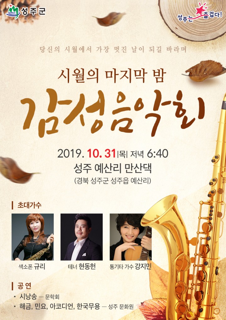 [성주타임뉴스=김이환 기자] 깊어가는 가을의 정취를 더할 음악 공연이 성주읍 예산리 만산댁(경북유형문화재 제389호)에서 열린다.