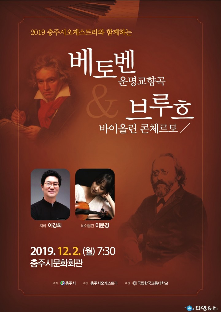 [충북타임뉴스=한정순기자]‘2019 충주시오케스트라와 함께하는 송년음악회’가 오는 12월 2일 저녁 7시30분 충주문화회관에서 열린다. ‘베토벤 운명교향곡과 브루흐의 바이올린 콘체르토’를 주제로 한 이번 송년음악회는 충주시오케스트라 지휘자 이강희(한국교통대학교 교수)의 지휘로 열리며, 전체관람가로 초대권 없이 전석 무료입장이다.충주시오케스트라는 지역 문화예술 기반확충과 위상확립을 위해 한국교통대학교와 충주시 협약으로 2011년 창단음악회를 개최한 이래, 매년 시민들을 위한 음악회를 열고 있다.이날 송년음악회는 베르디의 서곡 ‘운명의 힘’(La Forza del destino Overture)을 시작으로 선율에 우수적 낭만성이 깃들어 있으면서도 독창적이며 자유로운 형식을 추구하는 독일의 낭만주의 작곡가 브루흐의 바이올린 협주곡 제1번 사단조 작품번호 26(Concerto No.1 for Violin and Orchestra g minor Op.26)을 바이올리니스트 이문경과 협연한다. 협연자 바이올리니스트‘이문경’은 예일대학교 석사과정을 거쳐 뉴욕대, 단국대 강사를 역임했으며 현재 한국교통대학교와 서울시립대학교 겸임교수로 활동하고 있다.또한 2017 미국 글로벌 뮤직 어워드에서 은상을 수상하였을 뿐만 아니라 베를린, 비엔나, 프라하, 세종문화회관 등 유명무대에서 세계적인 오케스트라와의 협연과 세계적 무대에서 독주회를 개최하는 등 다양한 무대를 선보인 실력파 연주자이다. 시 관계자는 “이번 송년음악회는 정통클래식 공연에 목말라 있던 충주시민들의 갈증을 해소시켜 줄 수 있는 공연으로 충주시오케스트라의 수준 높은 공연이 지역의 문화예술 위상을 높이는 계기가 될 것"이라며, “많은 시민들이 공연을 통해 풍성한 연말을 보내시길 바란다"고 말했다.