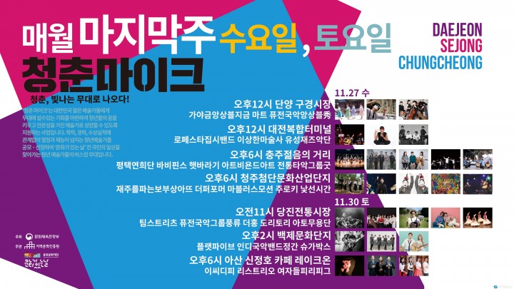 같은 시각 대전에서도 공연이 펼쳐지며 장소는 대전복합터미널 일원이다. 이 곳에서는 플라멩코, 집시재즈, 마술, 재즈의 팀들이 모여 볼거리가 풍성한 무대를 꾸미게 된다. 이 외에 11월 27일 수요일 오후 6시 충주 젊음의 거리 일원, 청주첨단문화산업단지 일원에서 공연이 펼쳐지며 29일에는 오후 7시부터 어쿠스틱 밴드팀 도리토리와 햇바라기의 음악 공연의 청주에 위치한 문화복합공간 가람신작(구 가람한정식)에서 진행된다.11월 30일 토요일에는 낮 공연으로 오후 12시 당진 전통시장 일원, 오후 2시 부여군에 위치한 백제문화단지 일원에서 밴드, 댄스 퍼포먼스, 마술, 블루스 등 다양한 장르의 팀들이 공연을 펼칠 예정이며 오후 6시에 아산시 신정호에 위치한 레이크온 카페에서의 밤 공연으로 11월 마지막 주간공연을 마무리하게 된다. 공연과 관련된 내용은 충북문화재단 블로그, 페이스북, 인스타그램 등의 SNS에서 확인 가능하다.문화체육관광부가 주최하고 (재)지역문화진흥원 문화가 있는 날 사업 추진단과 (재)충북문화재단이 주관하는 ‘2019 문화가 있는 날 청춘마이크-대전‧세종‧충청권 사업’은 다양한 장르의 청년 문화예술인들에게 공연에 설 수 있는 기회와 지원을 통해 성장 발판의 기회를 제공하면서 지역 주민들에게는 즐거운 무대를 볼 수 있는 기회를 제공하는 사업이다.올해 대전‧세종‧충청권에서는 대중음악, 양악, 국악, 뮤지컬, 댄스, 마술, 퍼포먼스 등 다양한 장르의 청년예술가 36팀이 권역 내 시군의 거리, 광장, 지역 축제 연계 등의 장소에서 공연을 진행한다. 모든 공연의 관람비는 무료이며 공연과 관련된 자세한 사항은 충북문화재단 생활문화팀(043-224-5615)으로 문의하면 된다.