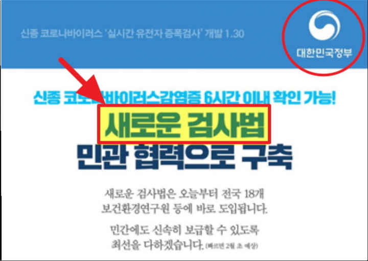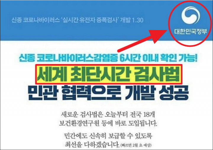 지난 30일 신종코로나바이러스 비상대책 발표에서 청와대는 ‘민관협력 세계 ’최단시간검사법‘ 개발성공을 발표하였으나, 국민들이 ’정부이미지를 챙기는 것도 나쁜 행위다‘ 라며 가짜뉴스라는 비난이 빗발치자 ’새로운검사법‘으로 수정하면서 ’가짜뉴스로 국민들에게 불필요한 공포심을 안기는 행위는 엄단하겠다‘고 공언하기도 하였다.