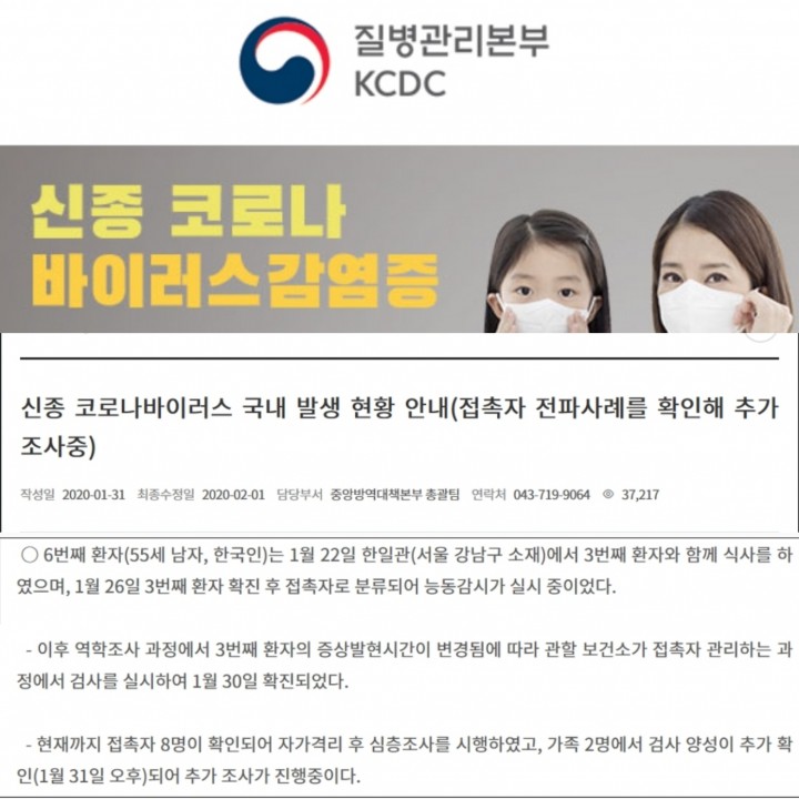 질본이 우한폐렴으로 제6차 확진자가 확인 한 시간은 30일 오후 1시45분, 발표는 4시간이 지난 5시34분에 기자단에게 문자 발송하였다.