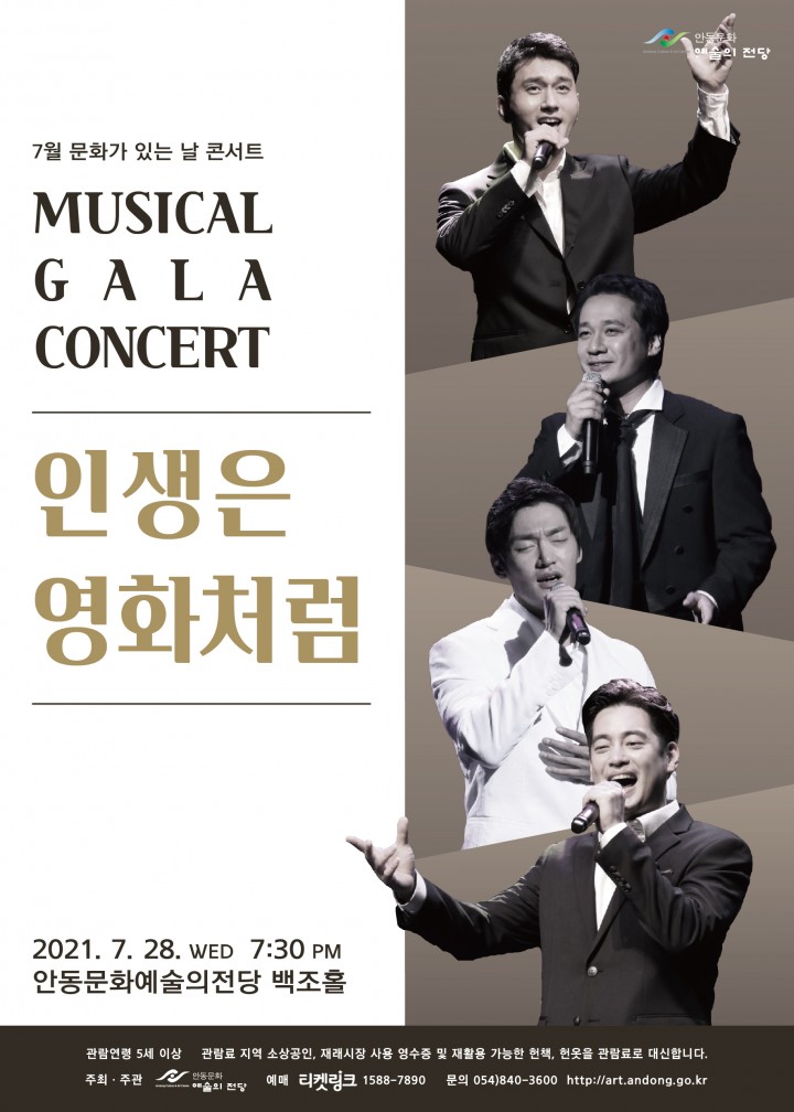 7월 문화가 있는 날 콘서트‘뮤지컬 갈라 콘서트 – 인생은 영화처럼’은 영화가 된 뮤지컬 혹은 뮤지컬이 된 영화의 주제곡을 남성 4인조 뮤지컬 앙상블‘제네다’의 가슴을 울리는 따뜻한 저음의 로맨틱한 보이스로 만나 볼 수 있는 공연이다. 뮤지컬 앙상블‘제네다’는 한국 뮤지컬 대상 남우신인상을 수상한 박동하, 유엔젤보이스에서 리더 겸 음악감독을 겸하는 임덕수, 오페라와 뮤지컬 가수로 활약하는 테너 임상훈, 팬텀싱어2에서 활약한 신명근으로 구성된 실력 있는 뮤지컬 가수들로 관객들에게 보다 쉽게 다가 갈 수 있도록 다양한 음악 활동을 하고 있는 단체이다.클래식 발성에 대중적 감성을 더한 감미로운 목소리로 한 편의 영화와 뮤지컬을 보는듯한 공연으로 영화 시네마 친국, 라라랜드, 노팅힐, 아가씨와 건달 등의 주옥같은 영화 속의 주제곡들을 매력적인 저음의 목소리로 감상할 수 있다. 안동문화예술의전당 7월 문화가 있는 날 콘서트‘뮤지컬 갈라 콘서트 – 인생은 영화처럼’은 사회적 거리두기 3단계 방역수칙을 철저히 지켜 진행된다. 5세 이상 관람이 가능하며, 환경을 보호하고 지역경제 발전에 이바지하고자 헌옷, 헌책 및 재래시장 사용 영수증을 관람료 대신 제시하면 입장권을 받을 수 있다. 자세한 사항은 전화(☎054-840-3600)로 문의하거나 안동문화예술의전당 홈페이지(http://art.andong.go.kr)에서 확인할 수 있다.